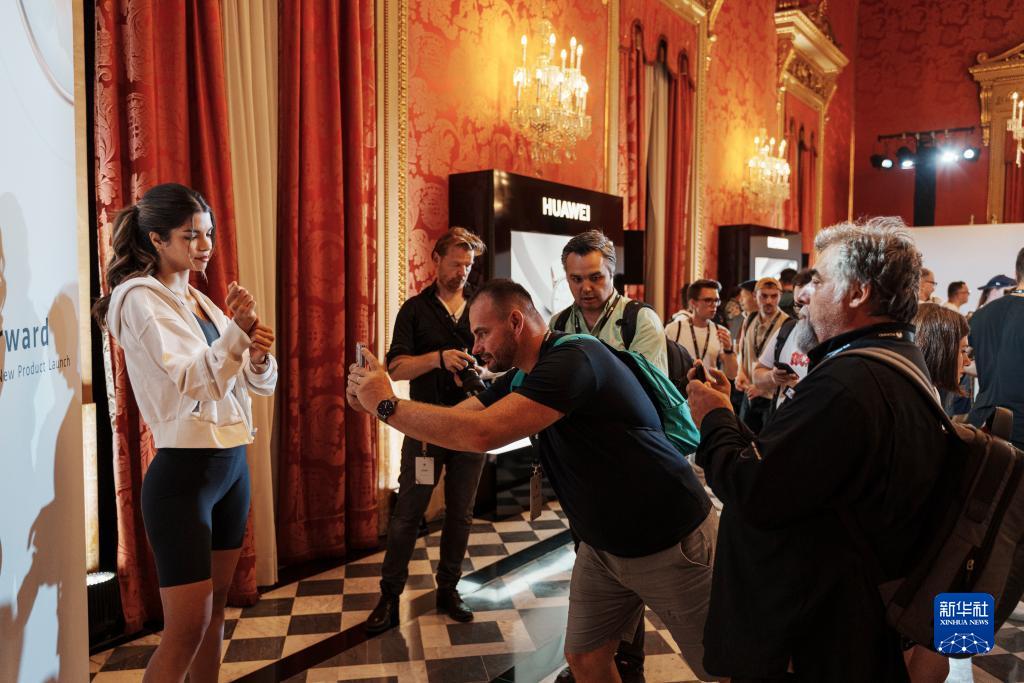 9月14日,在华为西班牙巴塞罗那新品发布会现场,与会者拍摄模特展示的最新穿戴产品。