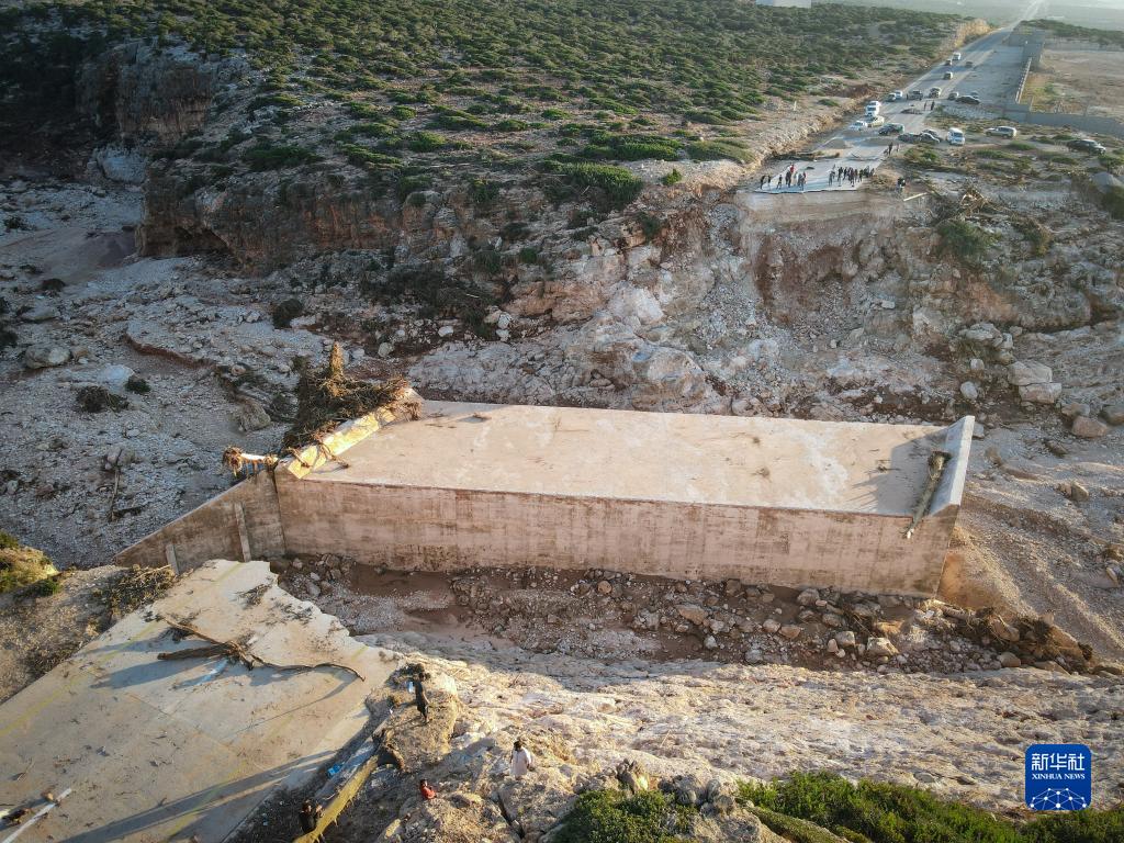这是9月15日在利比亚东部德尔纳附近拍摄的被毁的桥梁(航拍照片)。