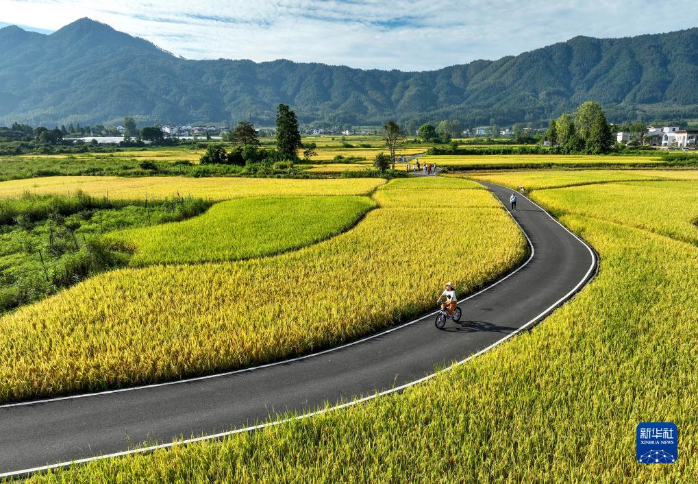 一位游客在黄山市黟县碧阳镇关麓古村附近骑行(9月2日摄) 。