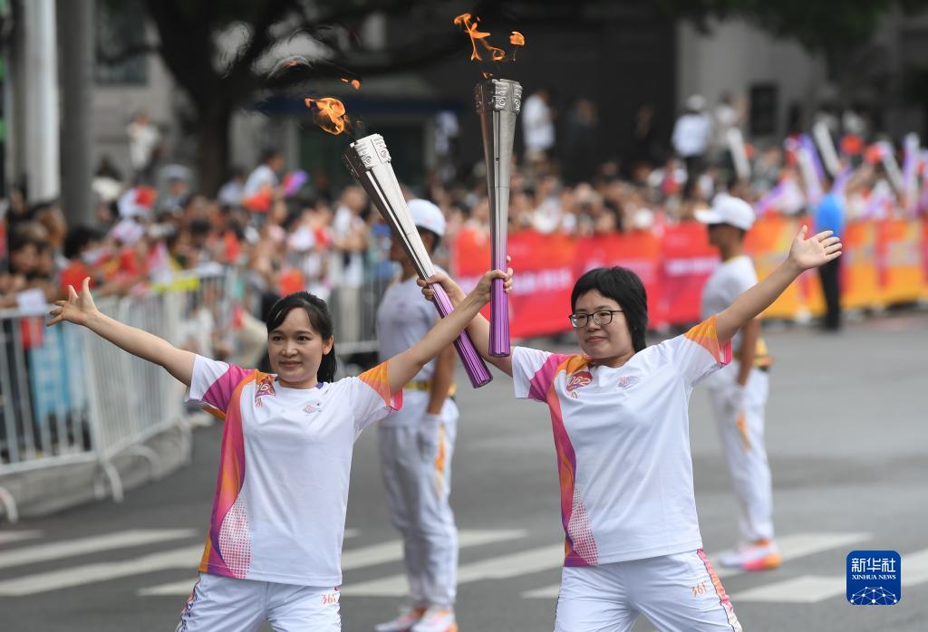 9月16日,火炬手吕芙蓉(右)和赵美丽在火炬传递中。