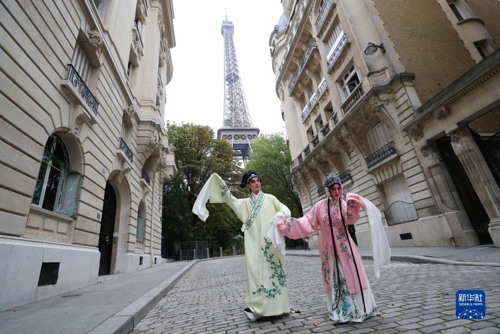 9月13日,江苏省演艺集团昆剧院院长施夏明(左)和江苏省演艺集团昆剧院国家一级演员孔爱萍在法国巴黎埃菲尔铁塔附近参加昆曲快闪。