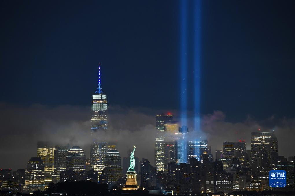 9月11日晚,美国纽约世贸中心遗址附近亮起象征纽约世贸中心“双子塔”大厦的光柱,纪念“9·11”恐怖袭击事件二十二周年。