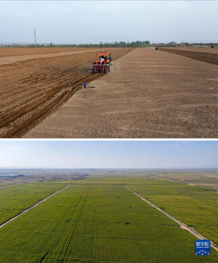这是一张拼版照片,上图是农民在宁夏吴忠市同心县韦州镇铺设滴灌带(资料图片,2023年4月20日摄);下图是9月14日拍摄的位于宁夏吴忠市同心县韦州镇现代高效节水灌溉项目建成后的高标准农田(无人机照片,新华社记者杨植森摄)。