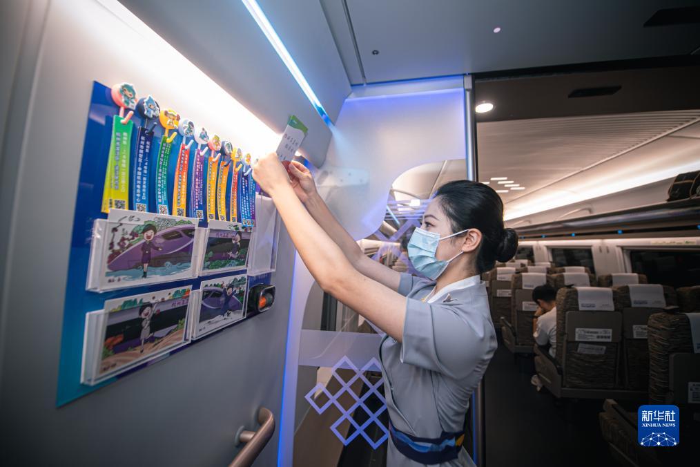9月16日,乘务员为亚运文创角补充产品。复兴号亚运智能动车组列车上设立了亚运文创角,为乘客免费提供明信片等文创纪念品。
