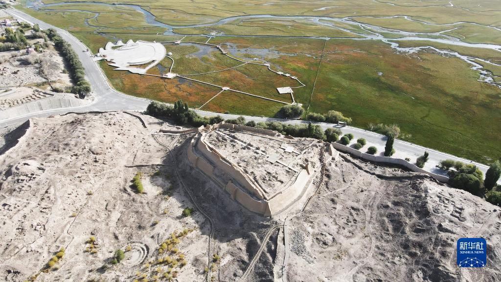位于新疆塔什库尔干塔吉克自治县的石头城遗址与金草滩湿地相邻(9月6日摄,无人机照片)。