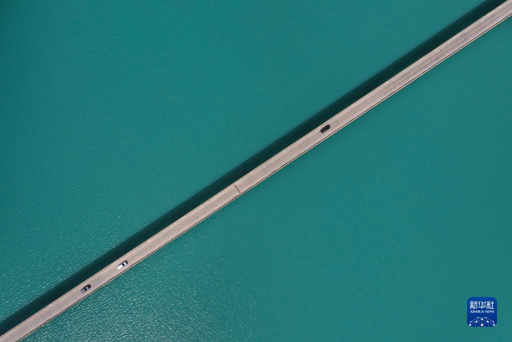 游客驾车穿行在新疆塔什库尔干塔吉克自治县“班迪尔蓝湖”上方的大桥上(8月28日摄,无人机照片)。