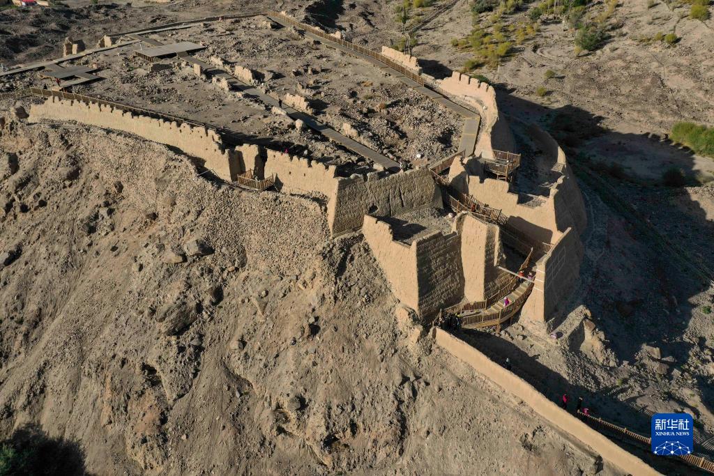 游客在新疆塔什库尔干塔吉克自治县石头城遗址游玩(8月28日摄,无人机照片)。