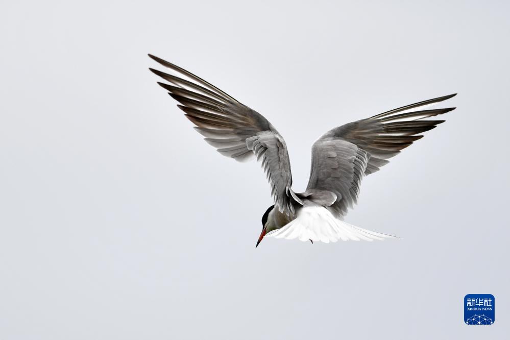 一只燕鸥在甘肃尕海则岔国家级自然保护区的尕海湿地上飞翔(7月7日摄)。