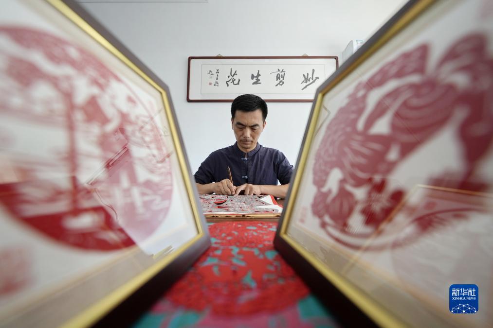9月16日,剪纸艺人在玉田县“非遗会客厅”工作室内创作剪纸作品。
