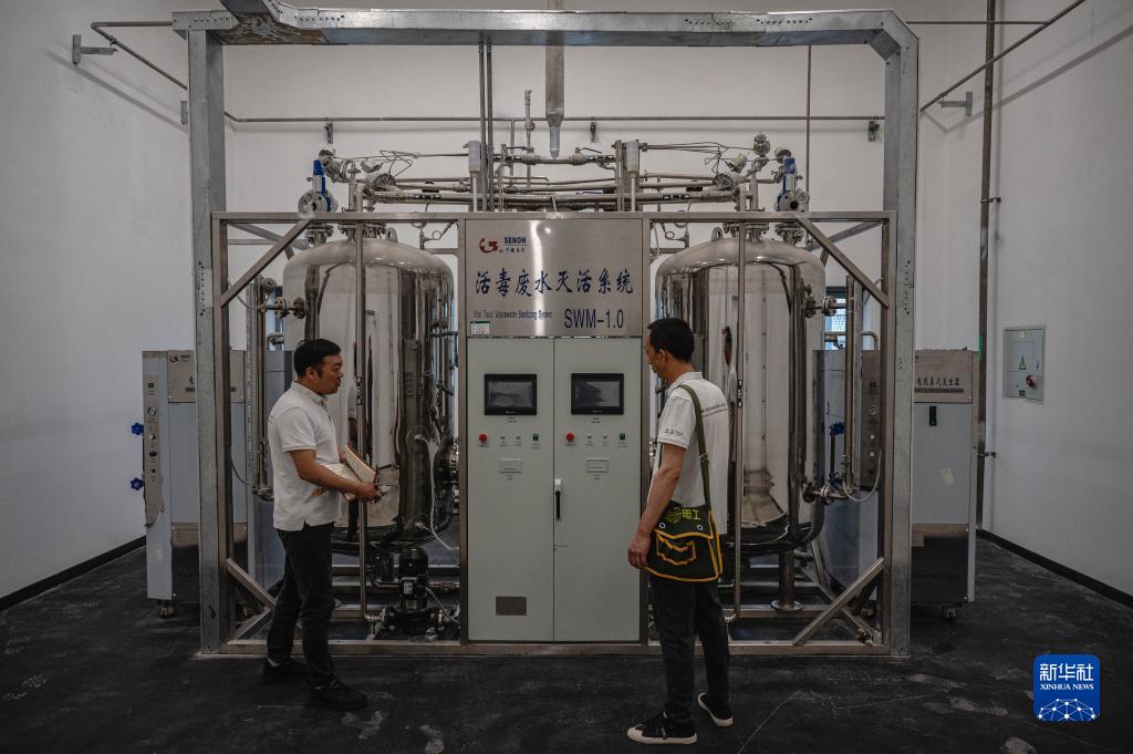 9月11日,中方技术服务组成员在埃塞俄比亚首都亚的斯亚贝巴非洲疾控中心检查待投入使用的p3实验室活毒废水处理系统。