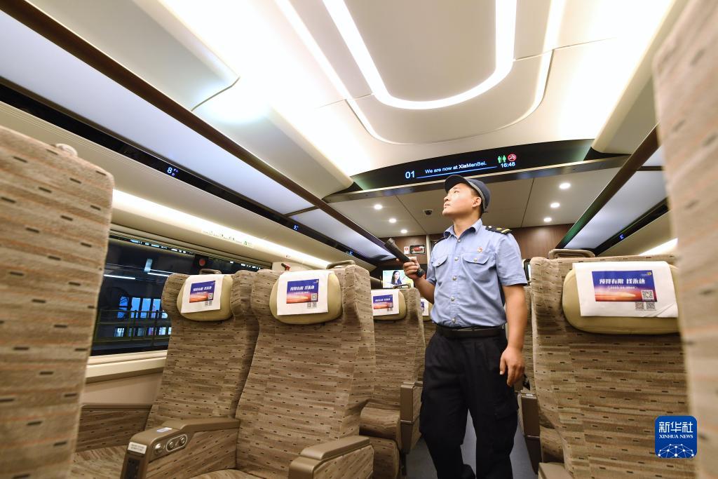 9月13日,高春成在复兴号智能配置动车组车厢内检查。