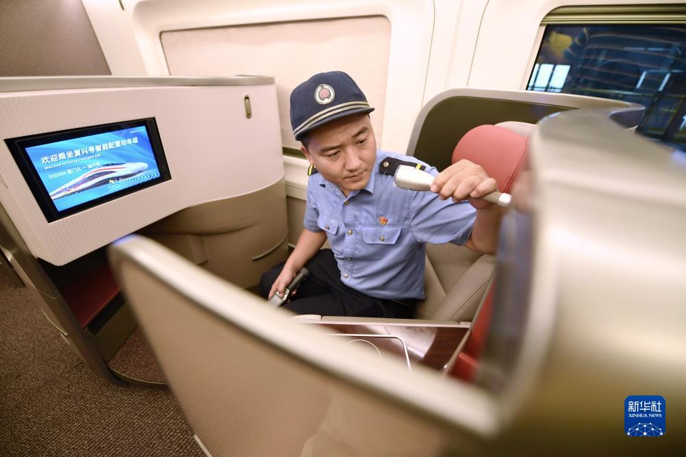 9月13日,高春成在复兴号智能配置动车组商务舱内检查设备。