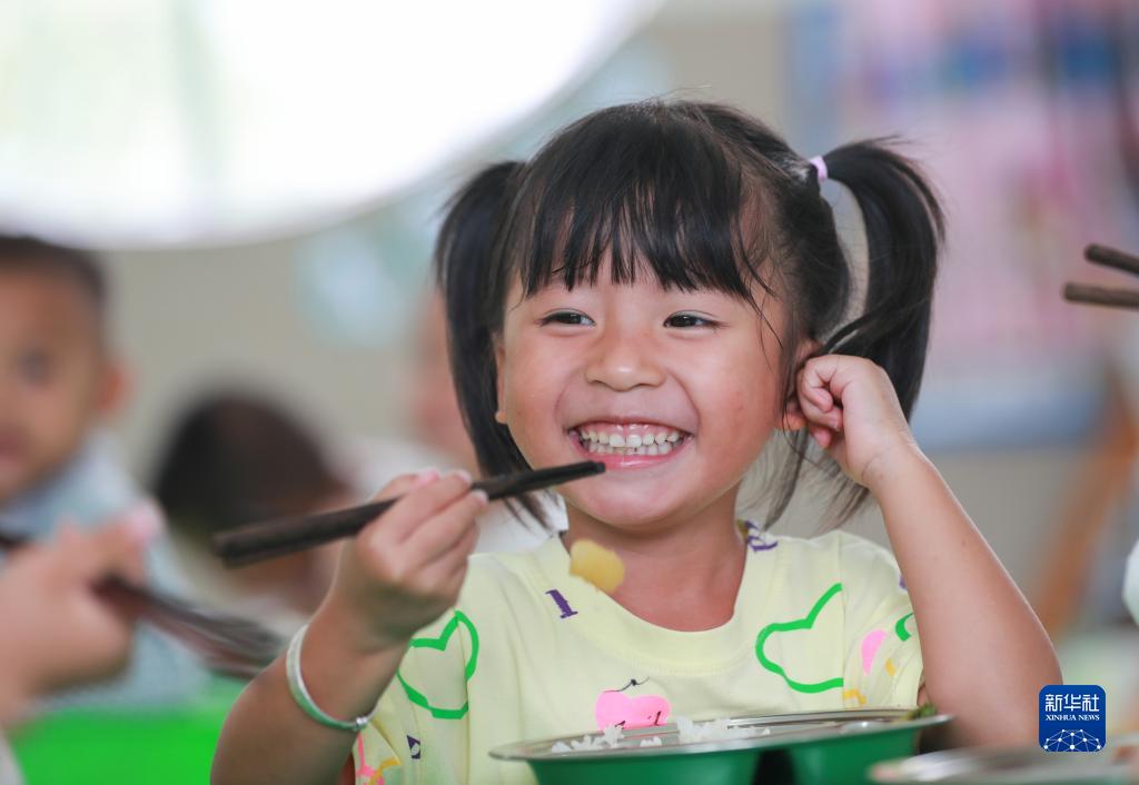 9月15日,贵州省从江县刚边壮族乡中心幼儿园的小朋友在享用免费营养午餐。