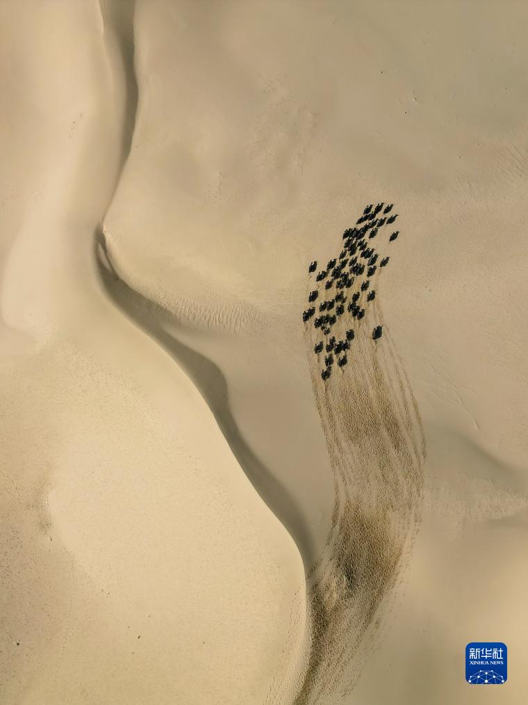 9月14日在阿尔金山国家级自然保护区库木库里沙漠拍摄的一群野牦牛(无人机照片)。