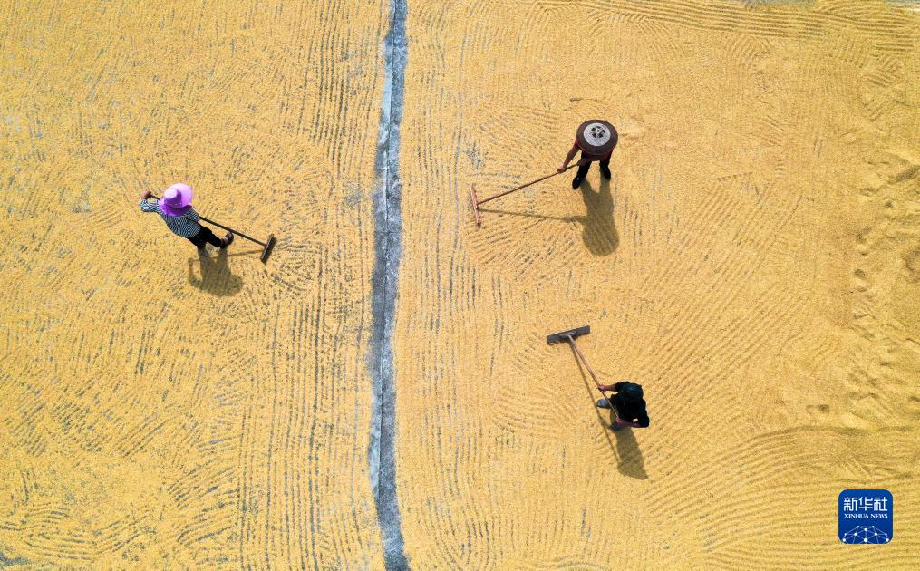金秋时节,各地农民抓住晴好天气晾晒收获的高粱、水稻、玉米等粮食作物,呈现多彩的丰收图景。