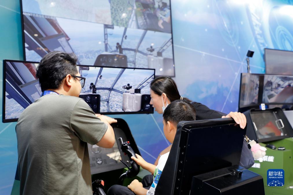 9月16日,观众在室内场馆直升机模拟飞行体验区现场体验。