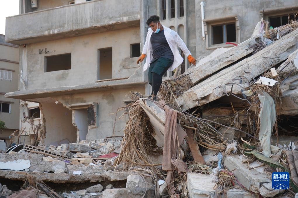 9月16日,救援人员在利比亚德尔纳的建筑废墟上工作。