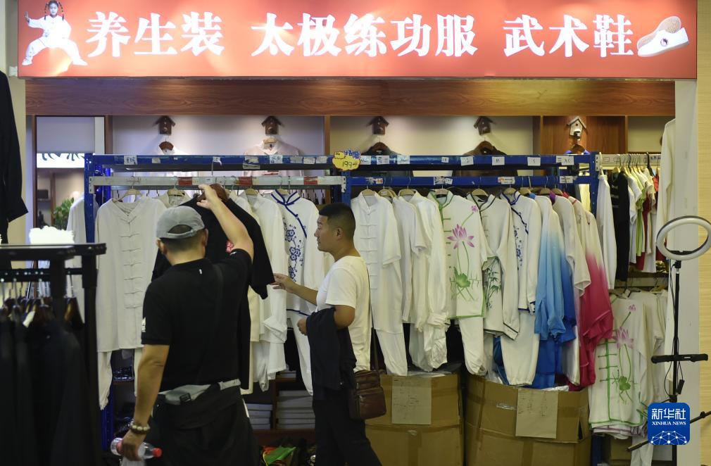 9月15日,游人在河南温县陈家沟的一家店铺内挑选太极练功服。