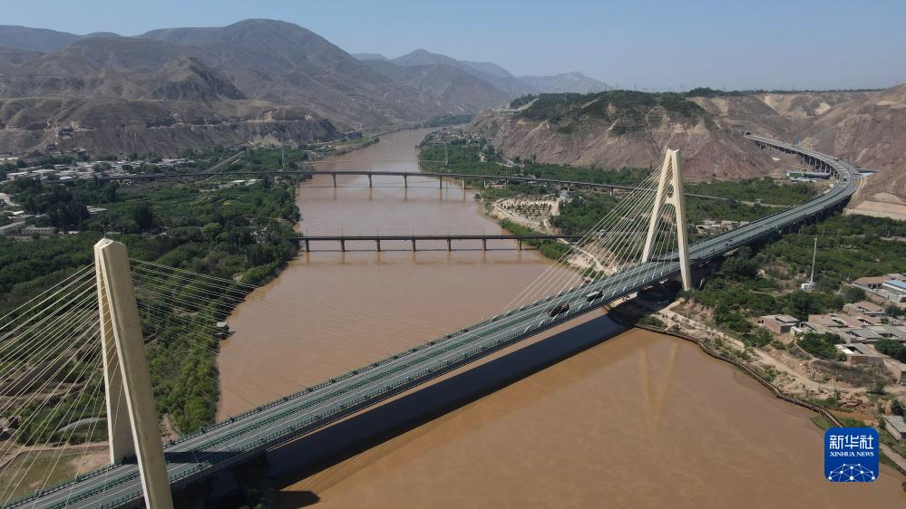 紧邻甘肃省兰州市西固区河口古镇的高速公路大桥横跨黄河(7月9日摄,无人机照片)。