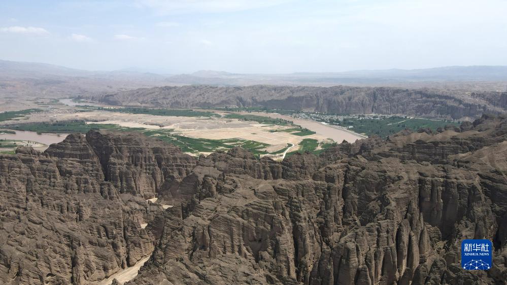 这是黄河岸边的甘肃省白银市景泰县中泉镇龙湾村和黄河石林景观(7月11日摄,无人机照片)。