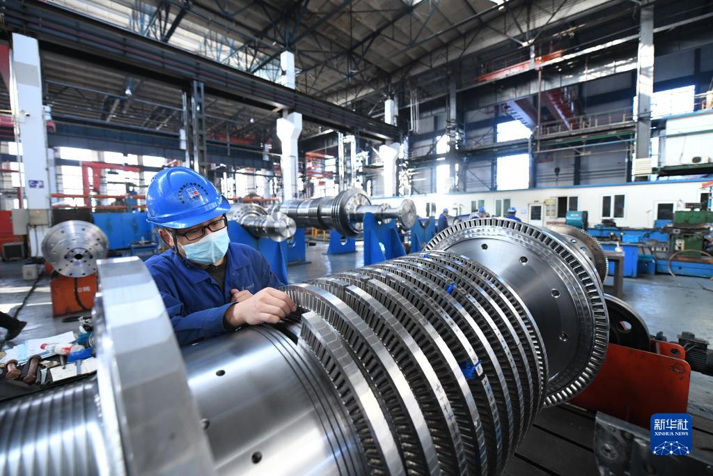 在哈电集团哈尔滨汽轮机厂有限责任公司的生产车间,工人在生产作业(2022年10月27日摄)。