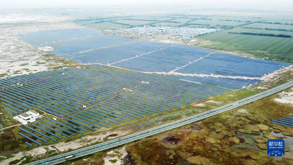 位于“石油之城”黑龙江省大庆市的一光伏发电项目基地(2021年9月9日摄,无人机照片)。