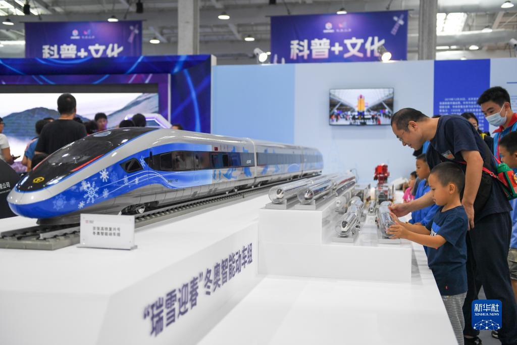 9月17日,在全国科普日北京主场活动展区,参观者参观展出的高铁模型。
