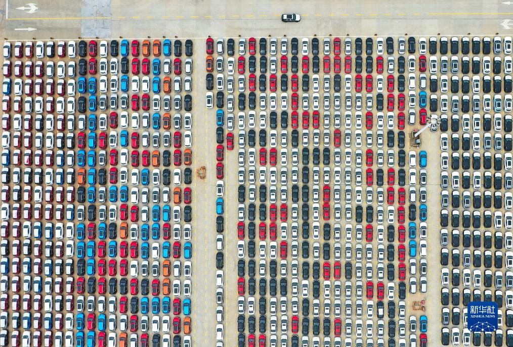9月16日,在连云港港滚装码头,汽车排列整齐,等待发运(无人机照片)。
