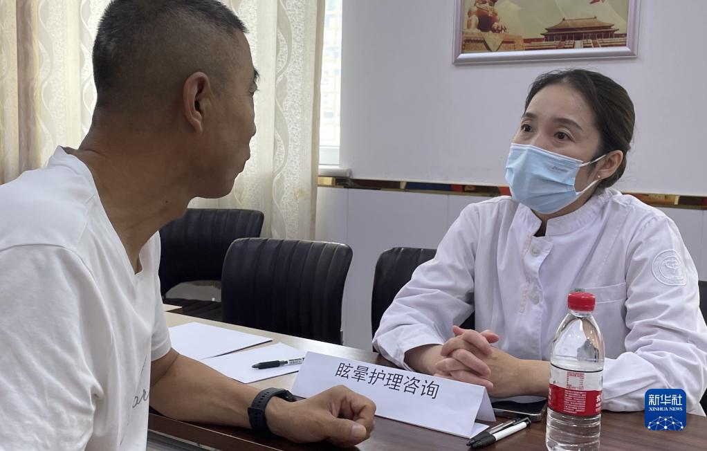 9月17日,北京友谊医院耳鼻咽喉头颈外科中心的护士长苑黎娜(右)与患者交流。