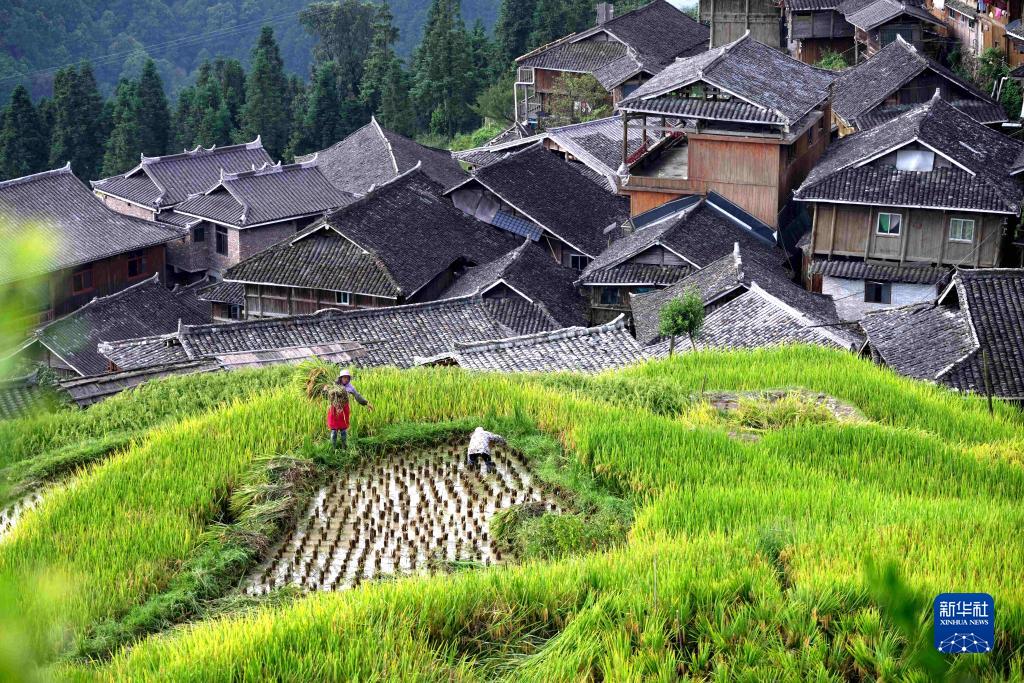 9月17日,村民在贵州省从江县加榜乡梯田里抢收水稻。