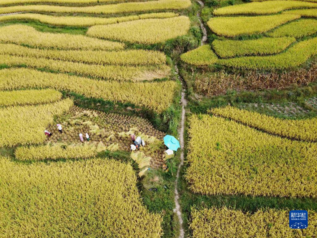 9月17日,在贵州省黔东南苗族侗族自治州施秉县城关镇下翁哨村,村民在收割水稻(无人机照片)。