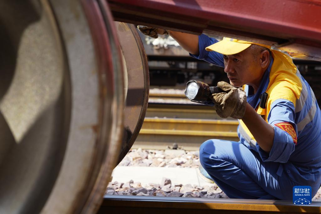 9月17日,中欧班列(郑州)整备班组货车检车员在检查脱轨自动制动装置。