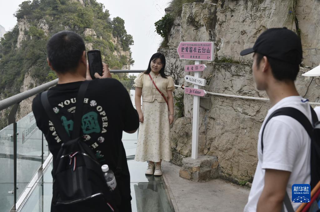 9月17日,游人在云台山景区的玻璃栈道上留影。