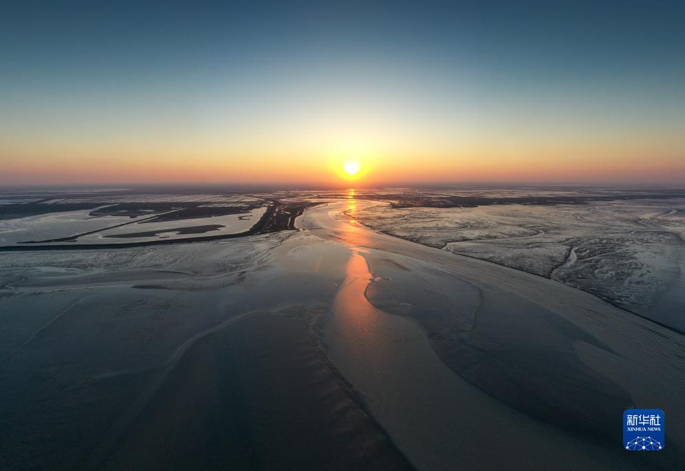 夕阳下盐城东台条子泥湿地景色(2023年9月1日摄,无人机照片)。