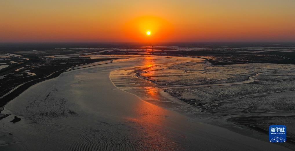 这是盐城东台条子泥湿地日落景色(2023年9月1日摄,无人机照片)。