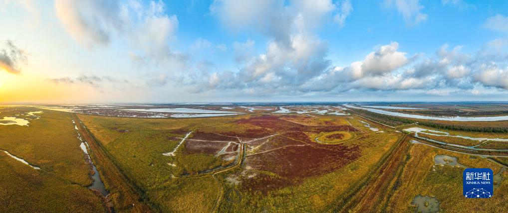 晨曦中的盐城湿地珍禽国家级自然保护区景色(2022年11月8日摄,无人机照片)。