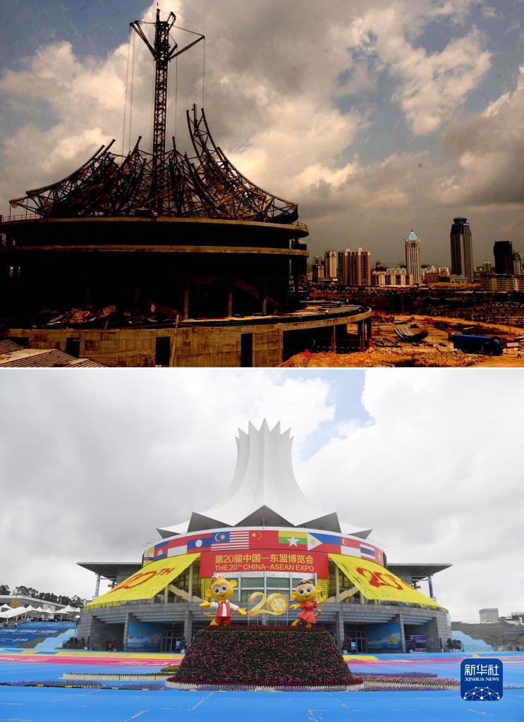 拼版照片:上图为2003年5月7日拍摄的建设中的南宁国际会展中心(新华社记者刘广铭摄);下图为2023年9月17日拍摄的南宁国际会展中心(新华社记者陆波岸摄)。