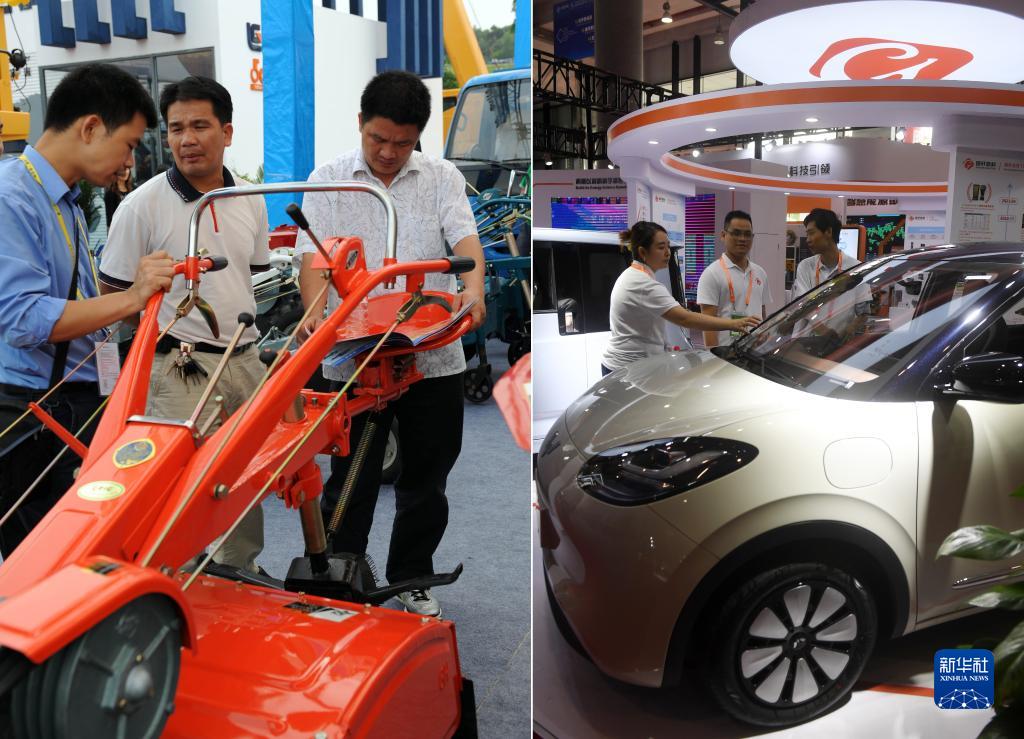 拼版照片:左图为2008年10月25日,在第5届中国—东盟博览会上,人们在选购手扶拖拉机(新华社记者刘广铭摄);右图为2023年9月18日,在第20届中国—东盟博览会上,人们在观看一款汽车(新华社记者陆波岸摄)。