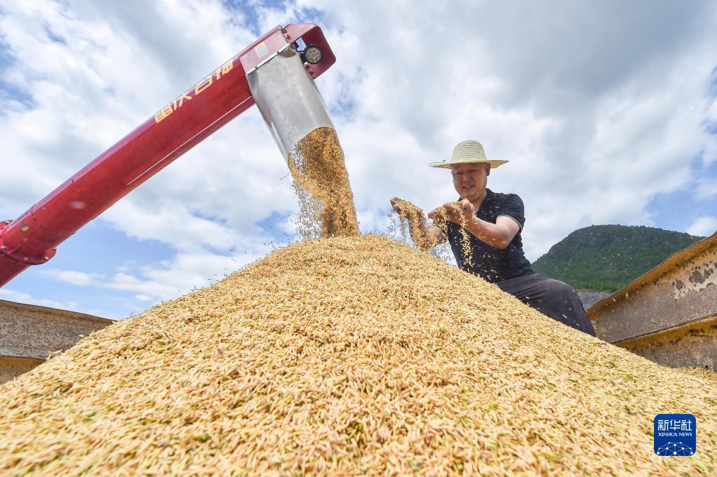 9月18日,农民在贵州省铜仁市松桃苗族自治县普觉镇水稻种植基地收获稻谷。