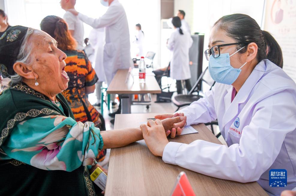 在新疆喀什市夏马勒巴格镇团结小区,来自山东中医药大学第二附属医院的援疆医生李荣华(右)在面向社区居民的义诊活动中进行义诊(9月16日摄)。