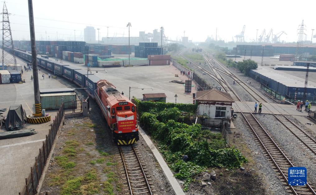 9月18日,一列发往蒙古国乌兰巴托的中欧(中亚)班列驶出天津港物捷三堆场(无人机照片)。
