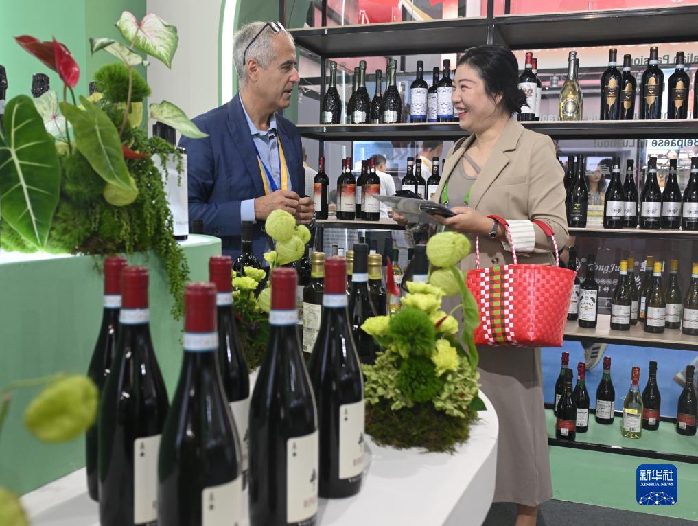 9月19日,一名中国采购商在与意大利酒类参展商交流。