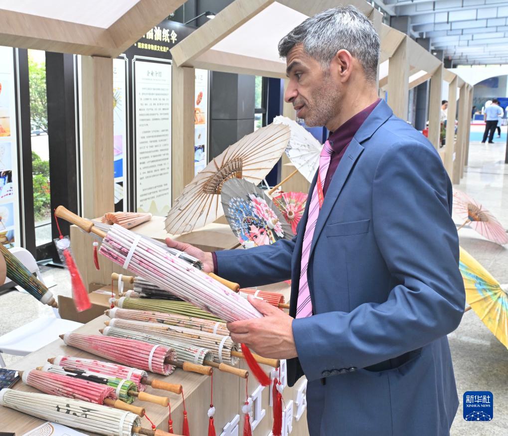 9月19日,一名嘉宾在了解挑选泸州油纸伞。