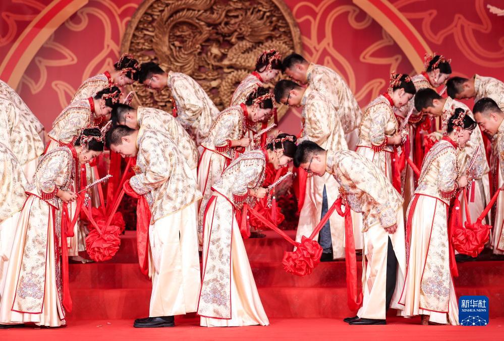 当日,在成达万(成都经达州至万州)高速铁路四川省蓬安县燕山寨隧道口的施工工地,来自中铁三局五公司各建设工地的38对新人,身着中国传统婚礼服饰参加集体婚礼。