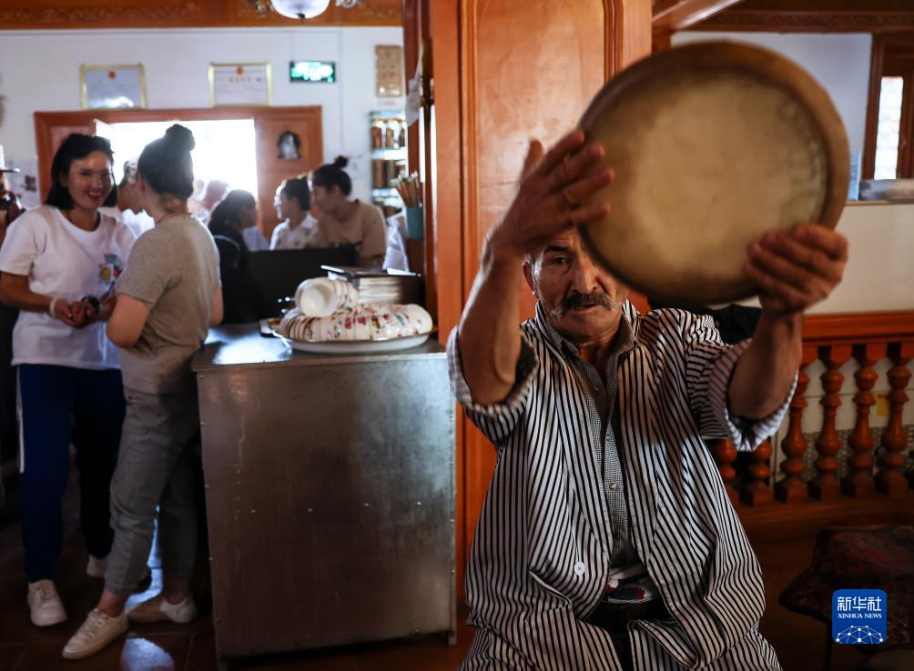 乐手在新疆喀什古城百年老茶馆内击鼓唱歌(9月7日摄)。