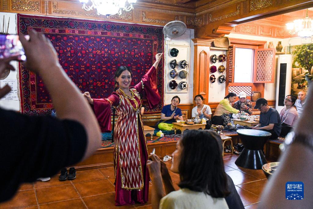 在新疆喀什古城百年老茶馆内,人们随音乐起舞(9月15日摄)。