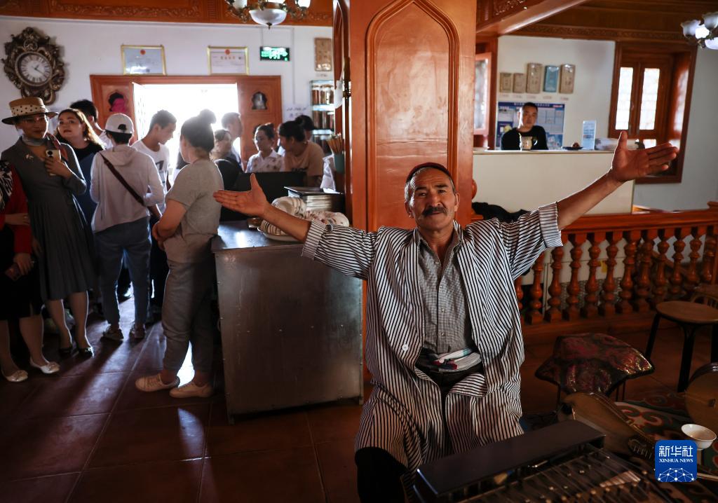 在新疆喀什古城百年老茶馆内,乐手在唱歌(9月7日摄)。