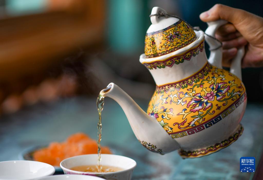 在新疆喀什古城百年老茶馆内,一名游客在斟茶(9月15日摄)。