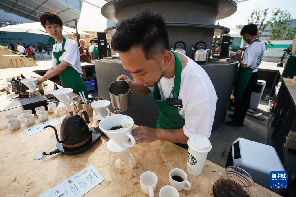 9月19日,在星巴克中国咖啡创新产业园开园仪式现场,工作人员制作咖啡。