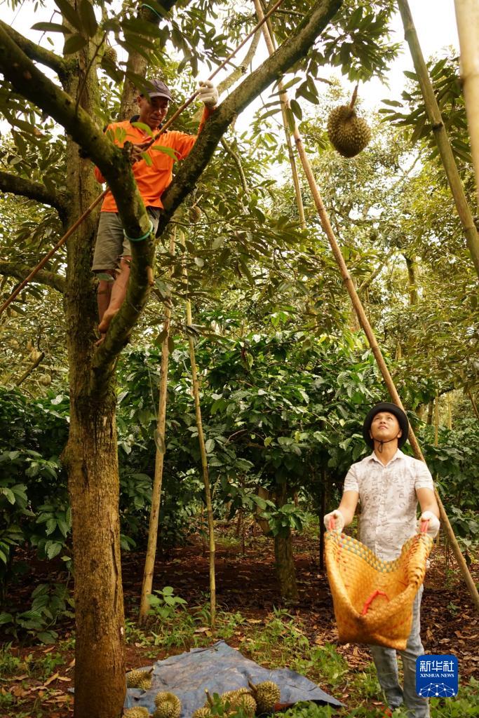 9月15日,在越南多乐省一家榴莲果园,两名果农配合采摘榴莲。